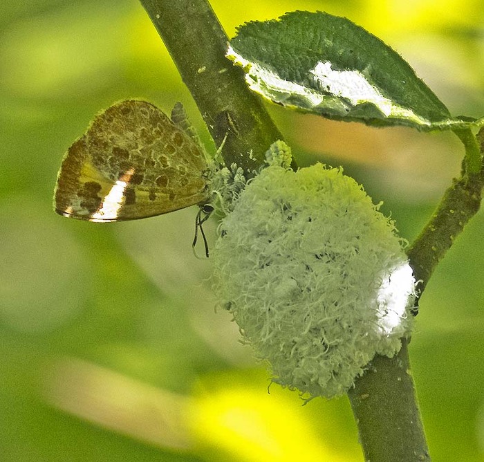 This species is unique in that it is the only butterfly in North America with a carnivorous larva. The adults also partially depend on the prey species- they can be found sipping the sugary exudate given off by woolly aphids.